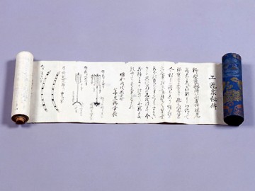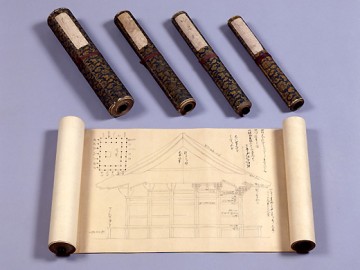 La draperie roulée du format de livre secret dans lequel j'ai mis une méthode par écrit (l'habileté dans l'attribution de bois) pour allouer chaque dimension de partie du bâtiment. Il a atteint le magistrat d'Edo Shogunate responsable d'entretien du chef de structures gouvernemental, Kashiwagis et il y a une déclaration écrite d'opinion spécialisée que j'ai lancé taromigieimommatsurigototora d'iheieimatsurigototo dans (1689) en 1689. Je me compose de "Gosho" "shinshakorebu" "butsudenkorebu" "monkorebu" "tokorebu" dans tous les cinq volumes et suis les renseignements qui sont importants dans la connaissance du bâtiment et de l'organisation de charpentier de l'ère d'Edo.
