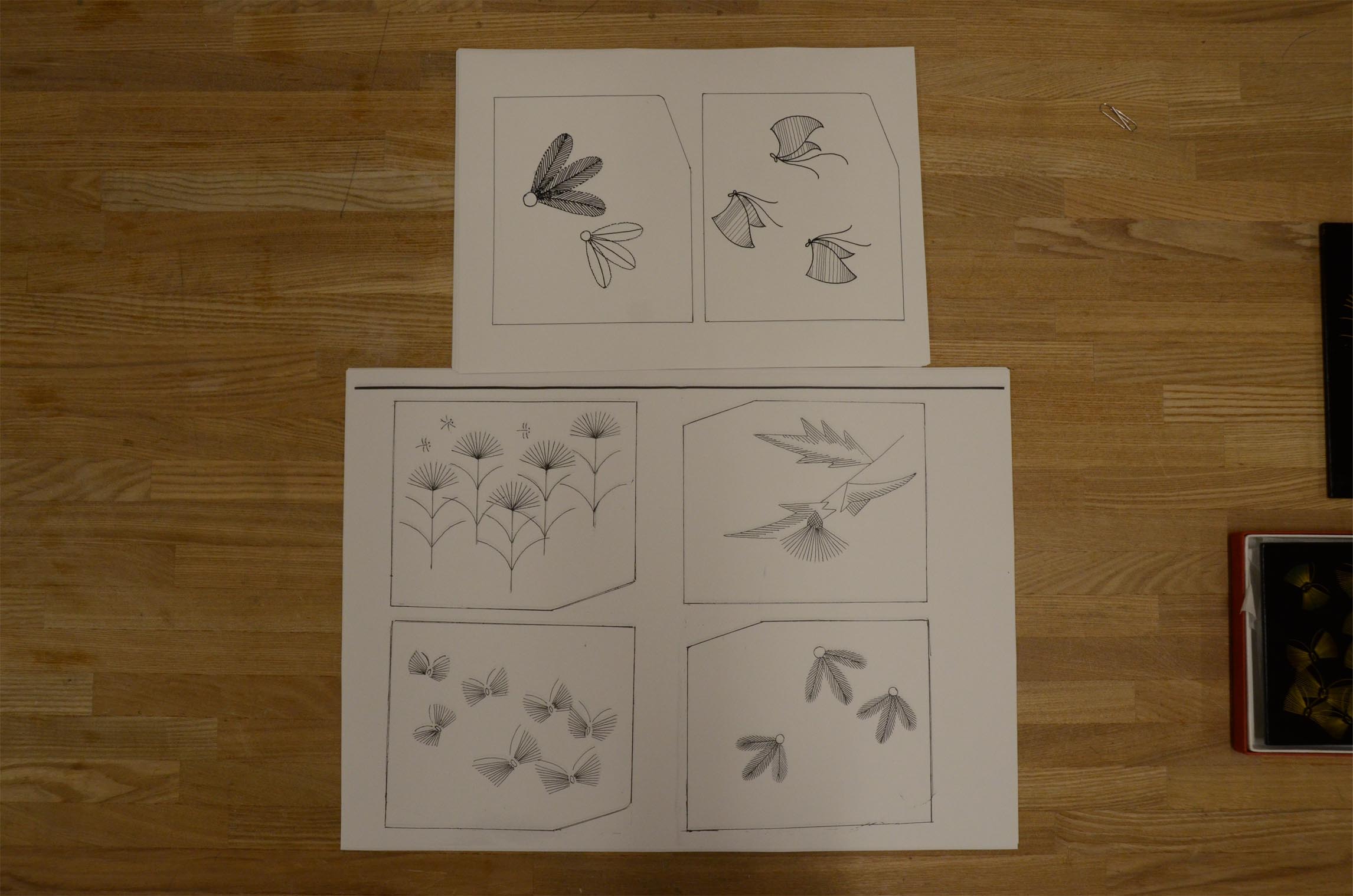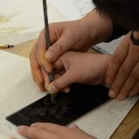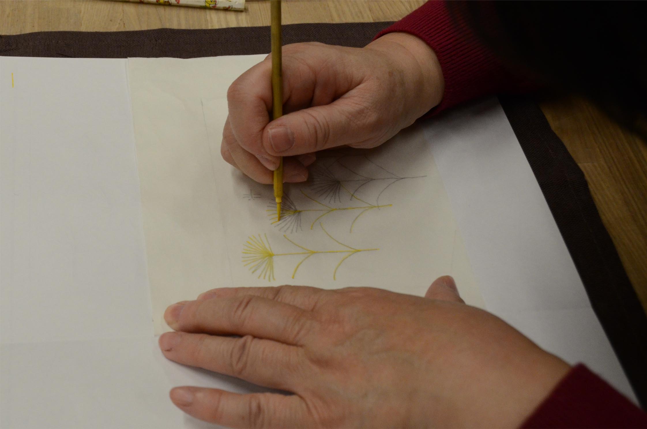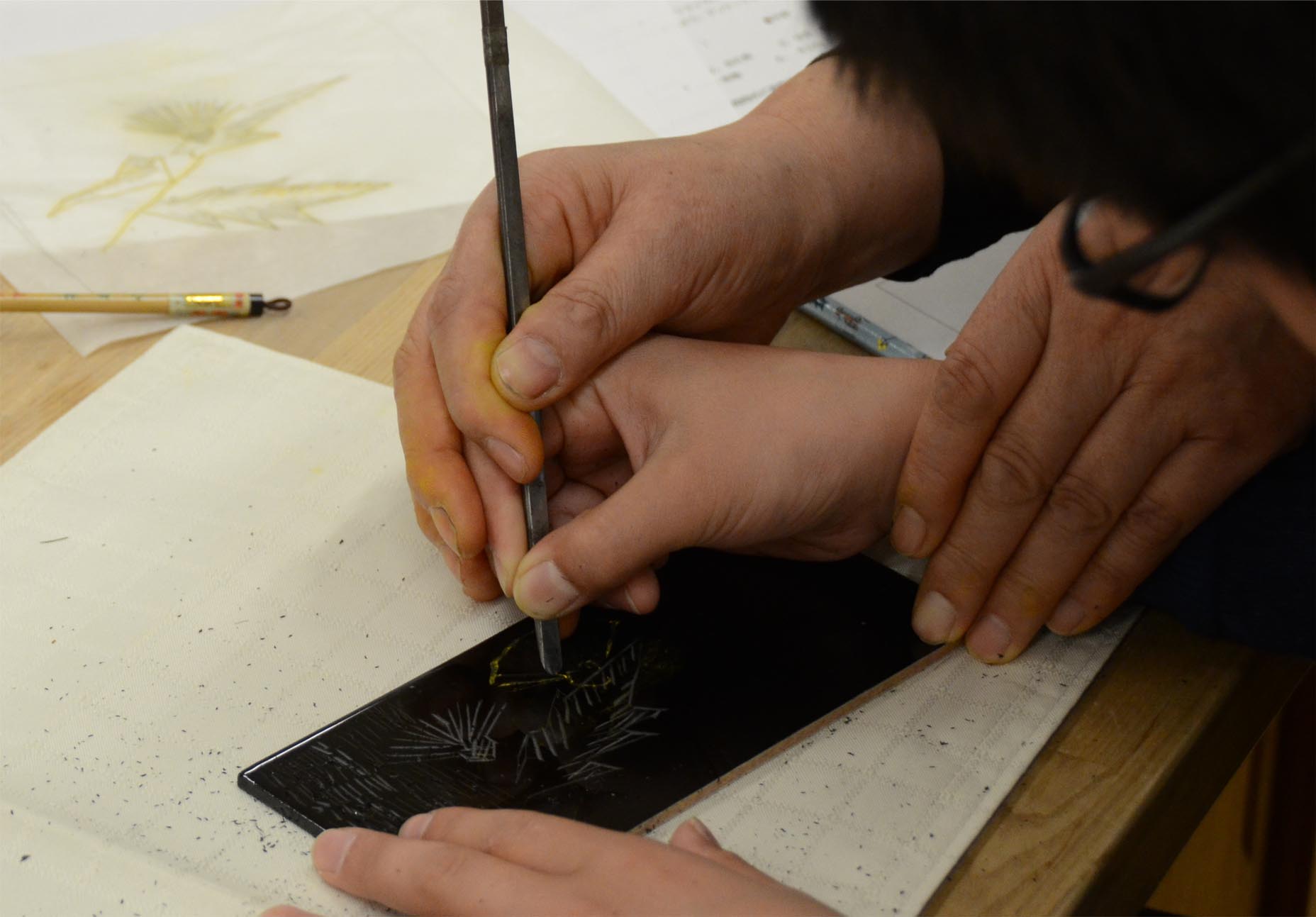 Quant au premier processus de la laque incrustée avec l'or, "un design pour le fait de laquer est fait". Un design pour laquer (le grain) signifie un design dans le japanners. Au début, je choisis le design et le tire sur la trace. Six sortes de designs qu'il était facile de sculpter pour le débutant ont été préparées à. Évidemment je peux le concevoir par soi-même. Comme il est très difficile de sculpter une courbe, quant au débutant, le design que j'ai constitué sur la base d'une ligne droite semble être bon. Il faut 6-7 ans même au moins avant que je sculpte une ligne aussi voulue avec une laque incrustée avec l'épée d'or. |