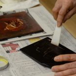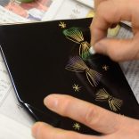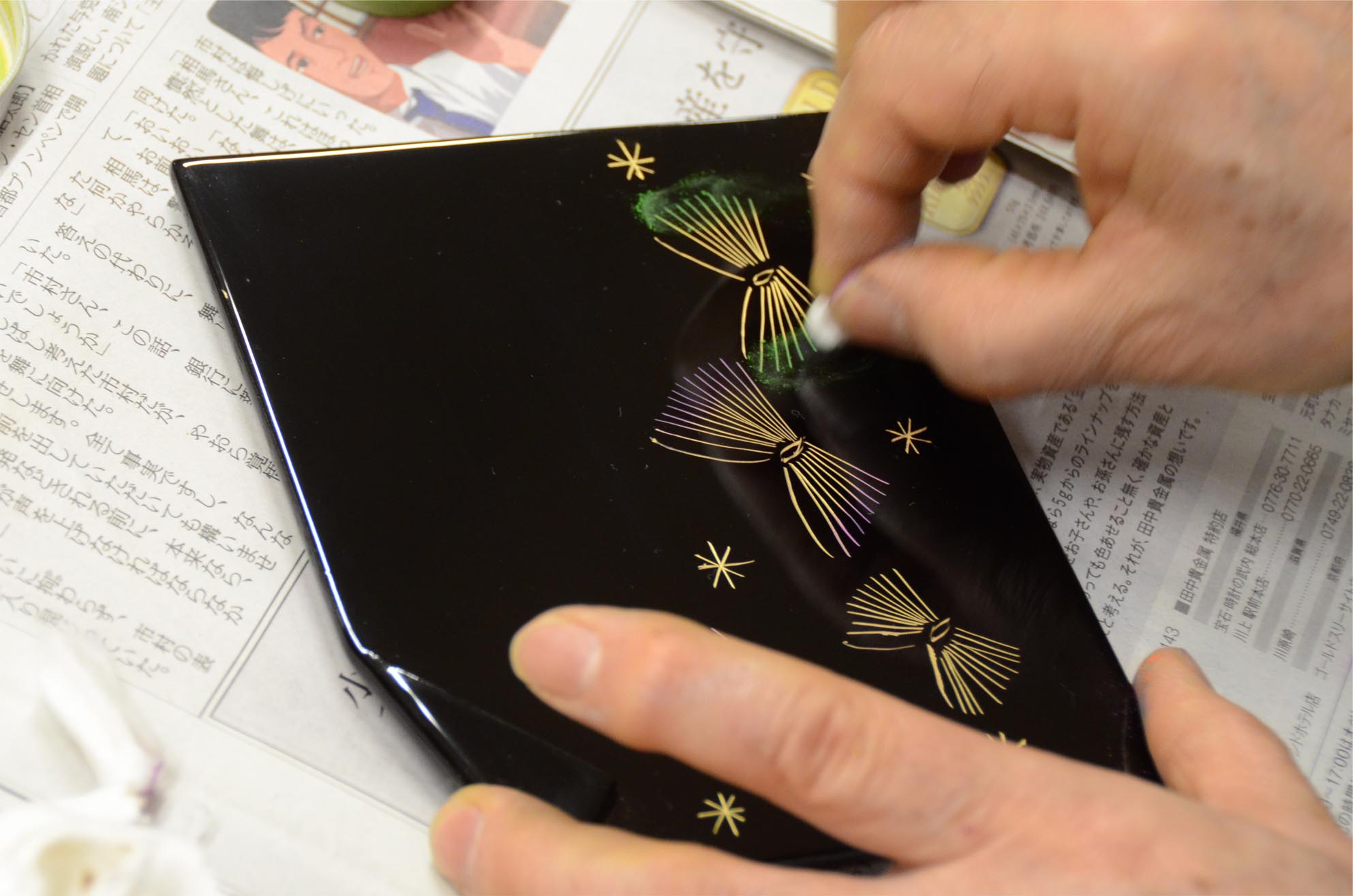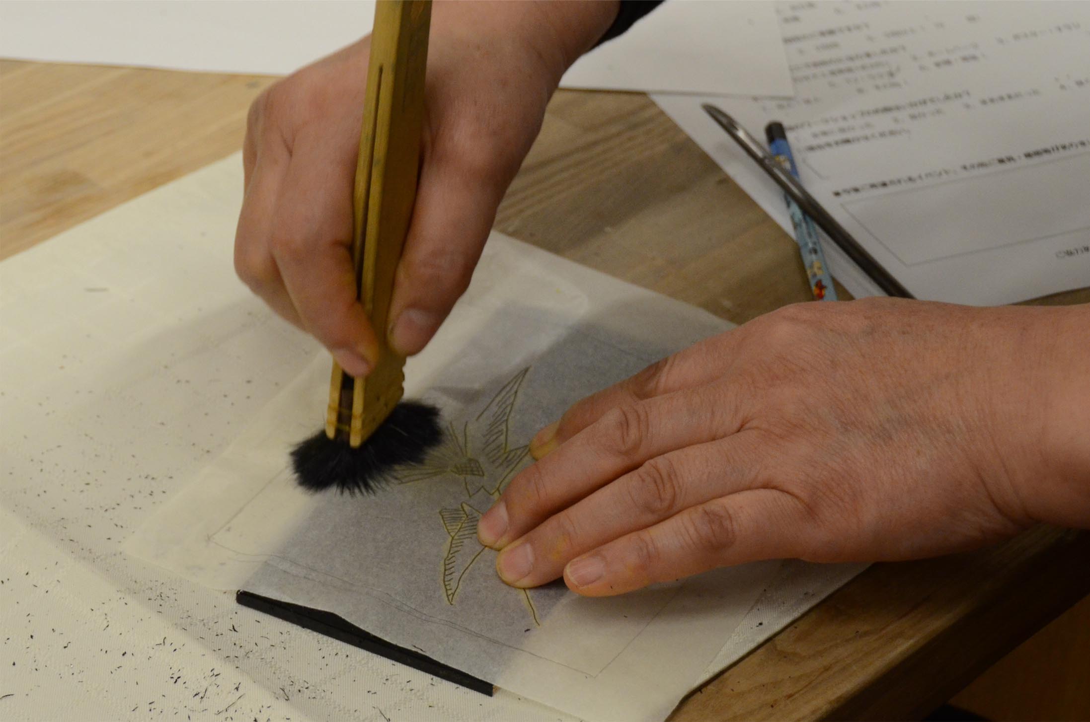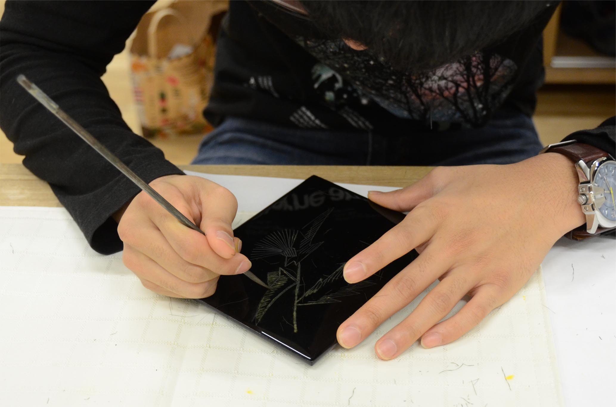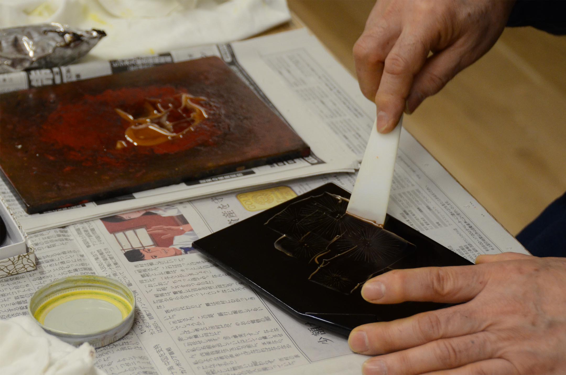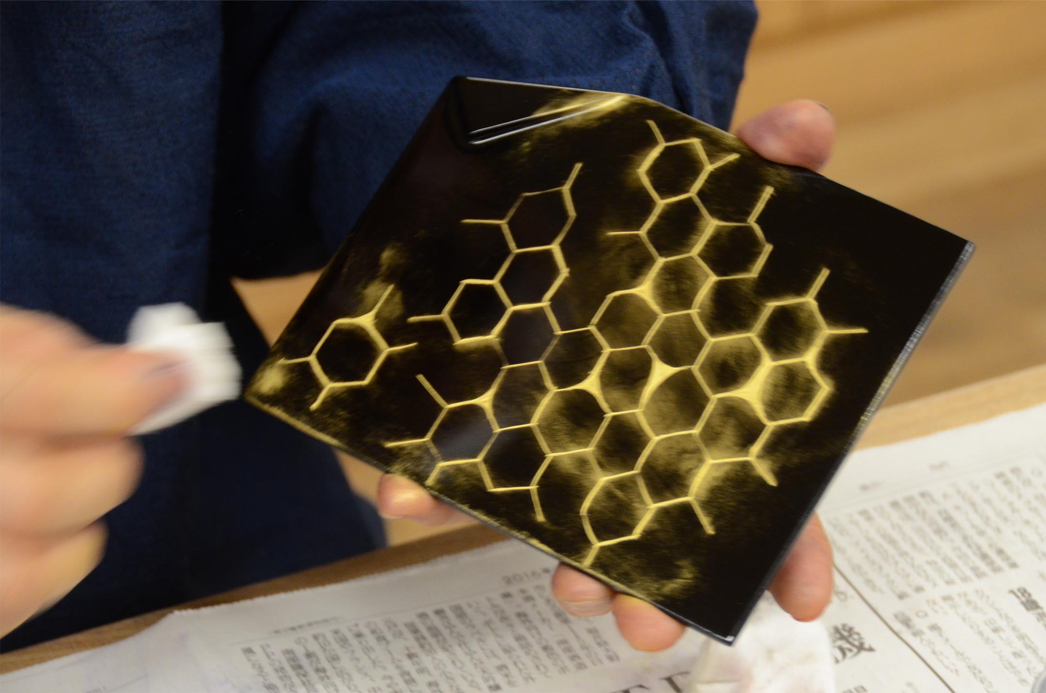 J'imprime la laque sur le fossé que j'ai sculpté et suis entassé et colle la poussière d'or ensemble. M. Norio a mis la poussière d'or dans la plaque de la chaque personne pour qu'un participant n'ait pas reçu des rougeurs avec la laque. |