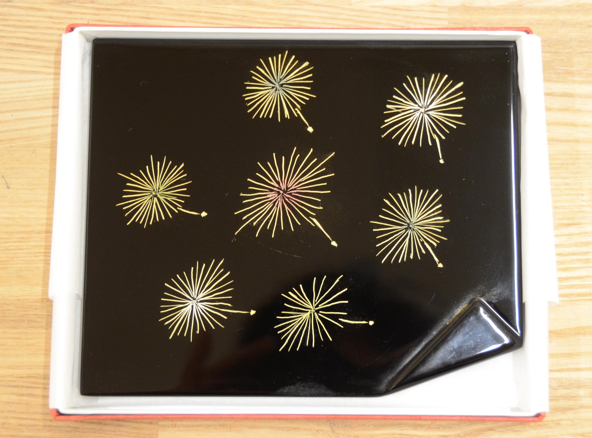 Il y avait la personne avait le problème avec le premier travail beaucoup, mais M. Ishimoto est poli La réalisation de plat de bonbon seulement par l'habileté de la laque traditionnelle incrustée avec l'or dans le monde. |