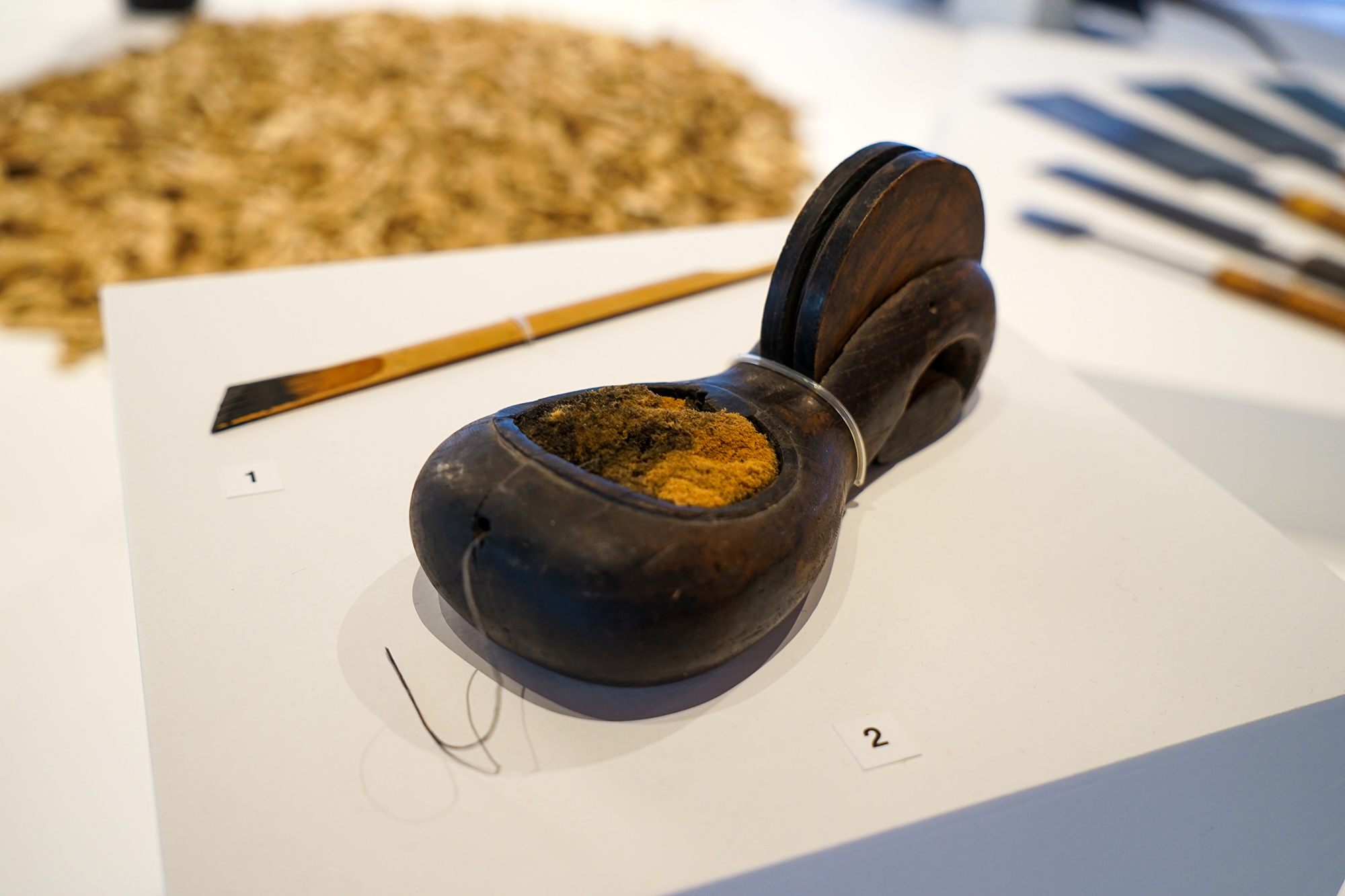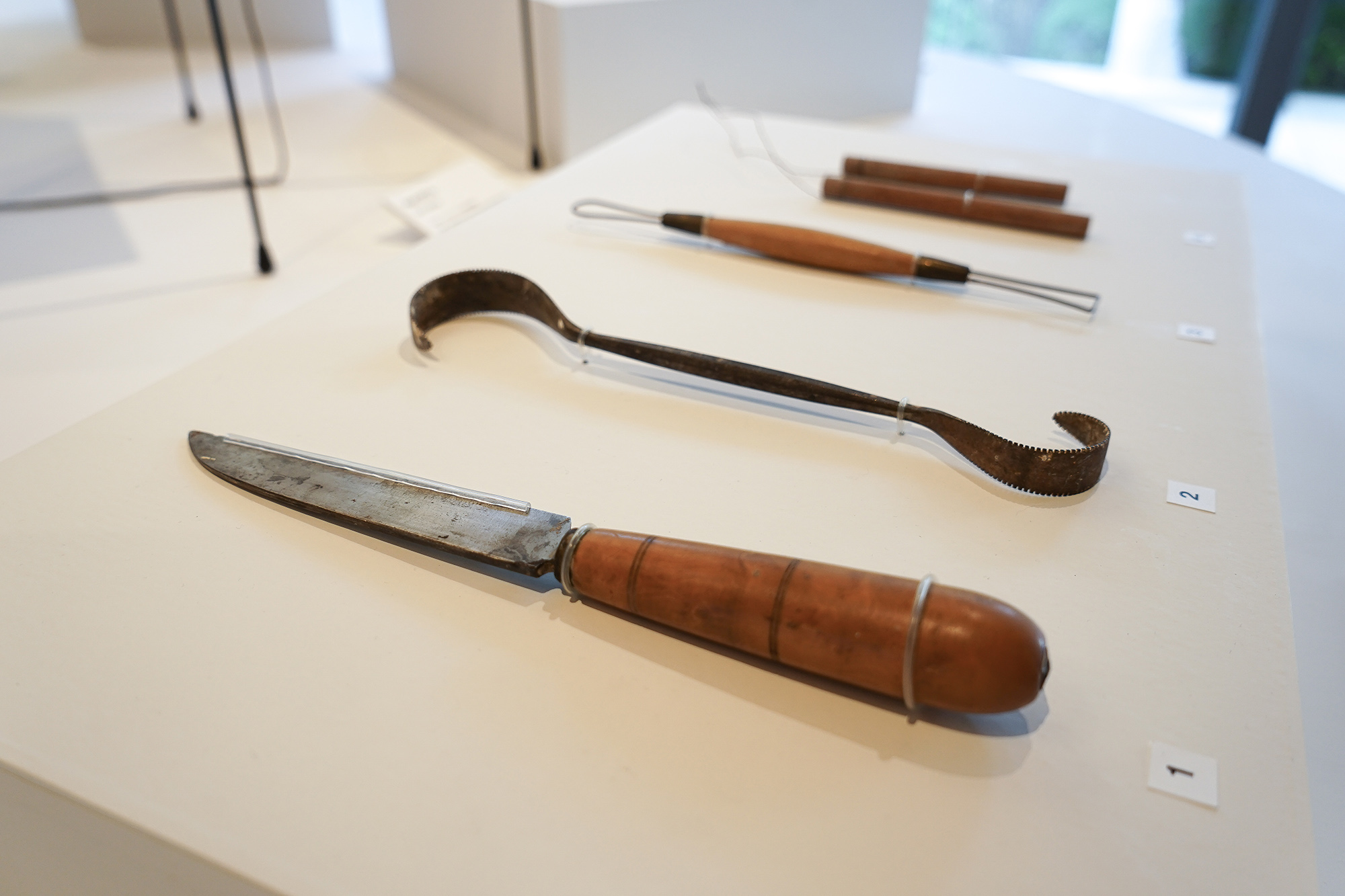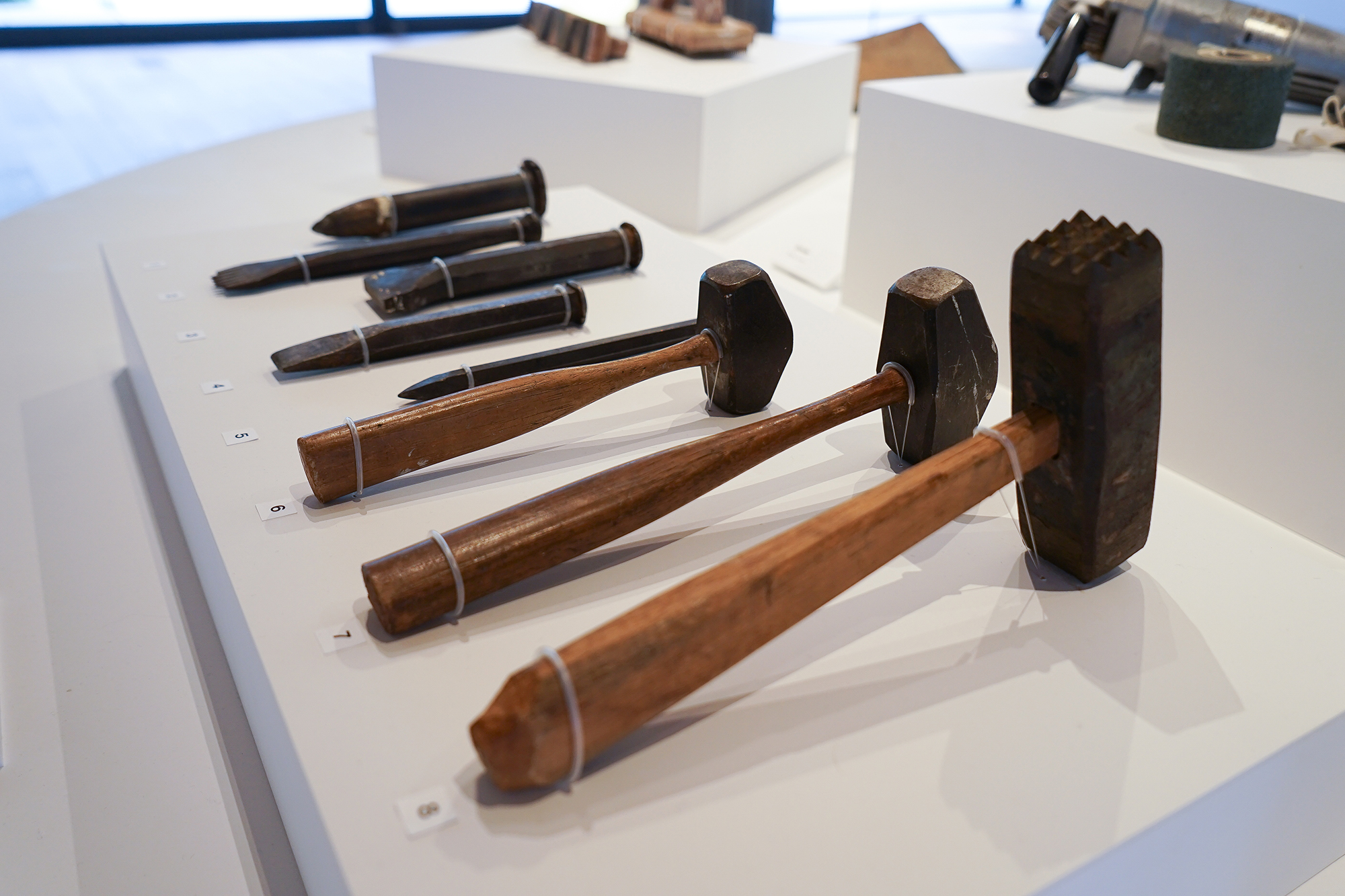 ![]() Le deuxième éventaire d'étalage est "des Outils de Stoneworking" (l'outil de la sculpture en pierre) le coin. En parlant d'Isamu Noguchi, il est gravé la pierre. Un outil et le matériel qui les a produits sont affichés. |