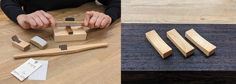 Je polis un hinoki avec l'outil de l'arbre à la forme de l'avion avec le papier de verre et fais deux restes de baguette.