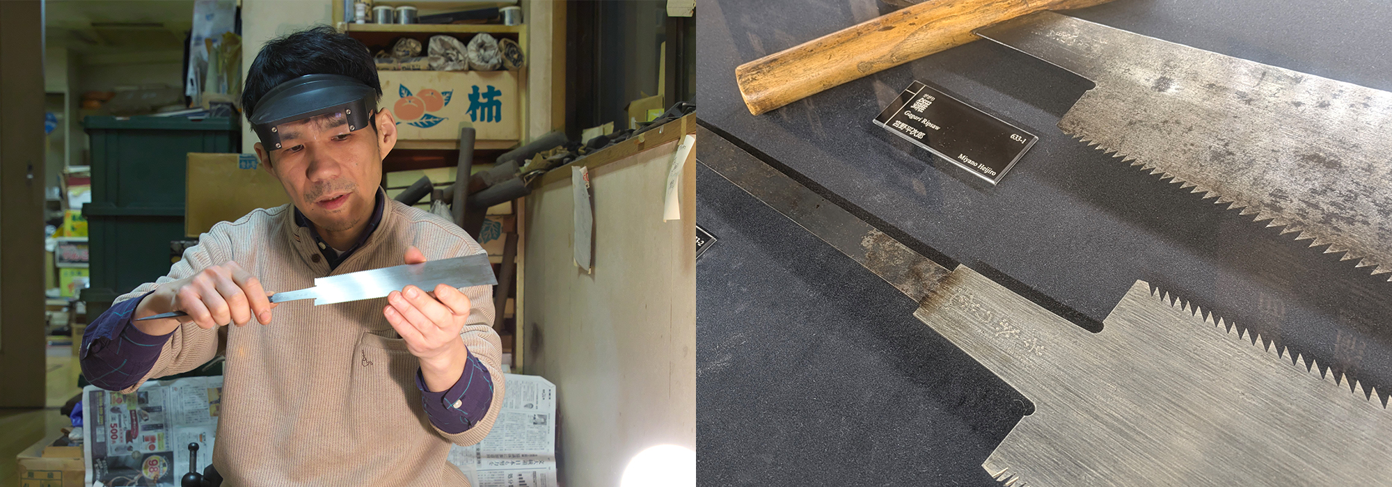 Je rencontre Noboru Tsuchida (le commerçant de magasin de couteau de Tsuchida) et suis la conférence spéciale du changement à ce jour d'un produit d'artisan de maître passé d'un outil de mains principalement sur une scie.