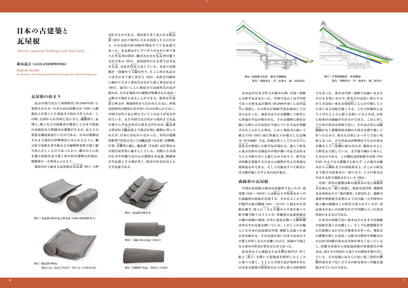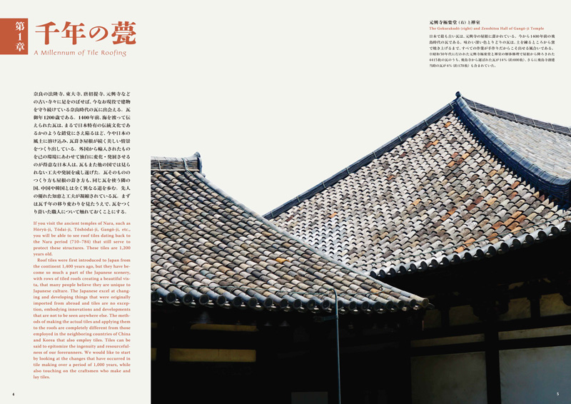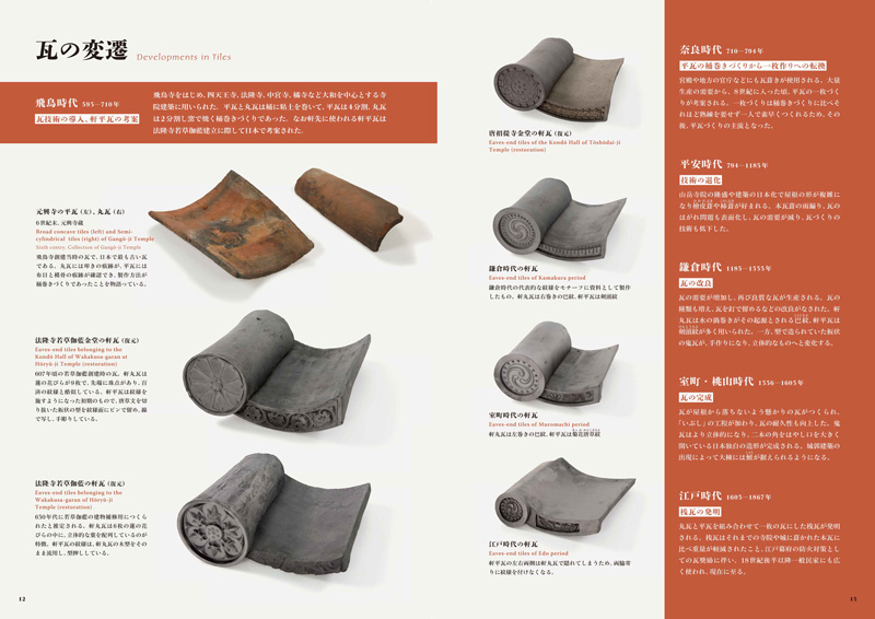 Vagues de toits et de nuages…célébré dans la chanson, la vue de nombreux toits couverts de tuiles, en s'étendant autant que l'œil peut voir, crée une image nostalgique de la ville japonaise traditionnelle. L'histoire de toits couverts de tuiles au Japon peut être remontée à 588 A.D. quand on dit que quatre experts de tuile sont arrivés dans ce pays de Kudara (la Corée) pour produire des tuiles à être utilisées pour le toit de Temple Asuka-dera. Quand la capitale de la nation a bougé plus tard à Heijō-kyō dans 710, le Temple d'Asuka-dera a été démonté et reconstruit dans Nara City où il a été rebaptisé le Temple Gangō-ji et même aujourd'hui, la partie des toits des bâtiments de Zenshitsu et de Gokurakudō de ce temple les tuiles incorporées qui ont été faites il y a mille quatre cents ans. Est-il Pourquoi devrait-il être que ces tuiles qui ont été créées en pétrissant et en tirant une argile pourraient continuer à avoir été utilisées depuis une telle longue période ?