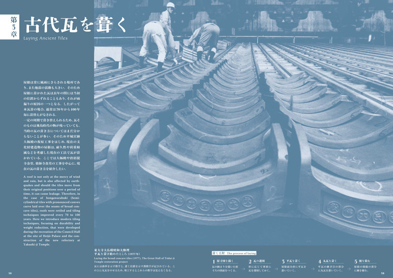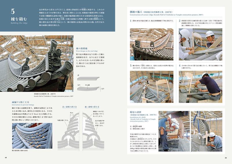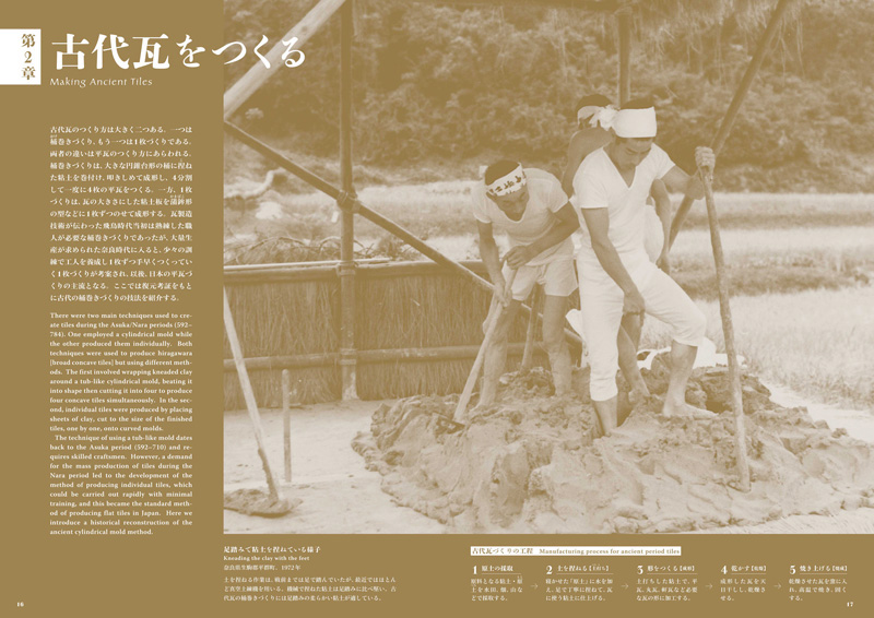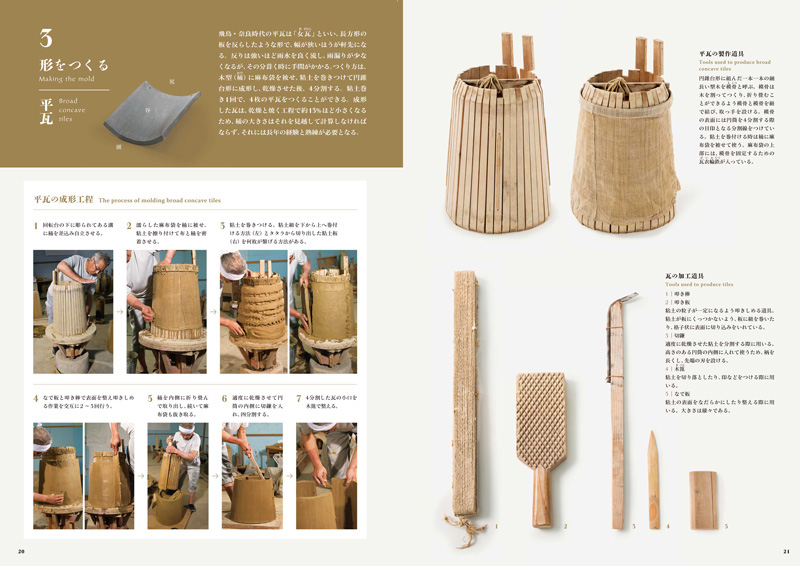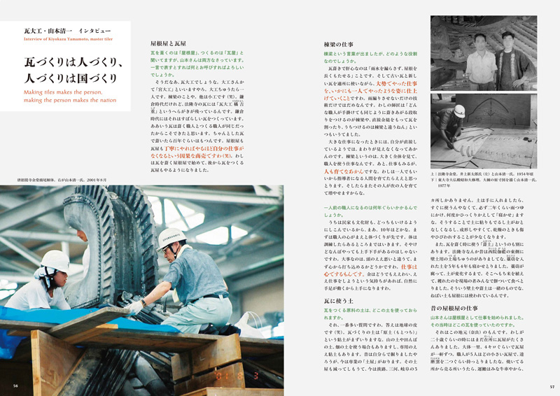 Le principal expert du Japon sur les tuiles de toit, YAMAMOTO Kiyokazu, qui est impliqué dans la restauration des toits de bâtiments qui ont été classifiés les trésors nationaux ou les propriétés culturelles importantes, a passé beaucoup d'ans en étudiant des tuiles anciennes et en utilisant le procès et l'erreur de recréer les techniques utilisées dans leur production. As a result, he has discovered that every stage in the process, from the preparation of the clay, the tools used to make, shape and fire the tiles, to the final laying of the roof, employs outstanding skill and technique.
