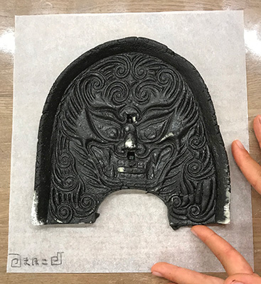 Au début, la tuile de fin de l'arête ancienne pousse l'argile qui a calculé du sol à un arbre de chaussure avec une chose formée par la planche et le prend en regardant la tuile "la fin d'arête mini-" et explique que je ressemble à la réalisation de chose = le biscuit pour cuire à une haute température.