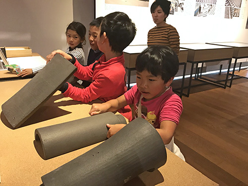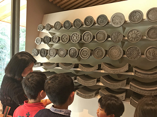 Pendant que le font cuire au four, la conversation de galerie par le conservateur. Qu'est-ce qu'une tuile ? Commencez par cela et prenez comment faire des tuiles anciennes et la vraie tuile dans une main et la soulever où la tuile de fin de l'arête qui a fait est dans le toit aujourd'hui, les enfants intéressent profondément.