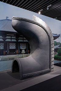 [en moisissant le coin ① de la tuile ancienne] J'affiche une tuile d'avant-toit et la tuile de fin de l'arête que j'ai affichée un toit dans six siècles - environ huit siècles.