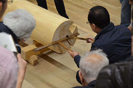 Au début, je compare un rondin à une colonne de périmètre et fais un compte créditeur sumi sur une colonne. J'ai décrit la ligne de base de ligne médiane et la chute intérieure, la position du tenon et ai introduit du signe du compte créditeur sumi d'exprimer chacun. Je l'écris dans la ligne où "un X" est sans fondement avec "○" dans la ligne efficace et semblez vous tromper juste, mais sont la règle que vous devez savoir si c'est un charpentier.