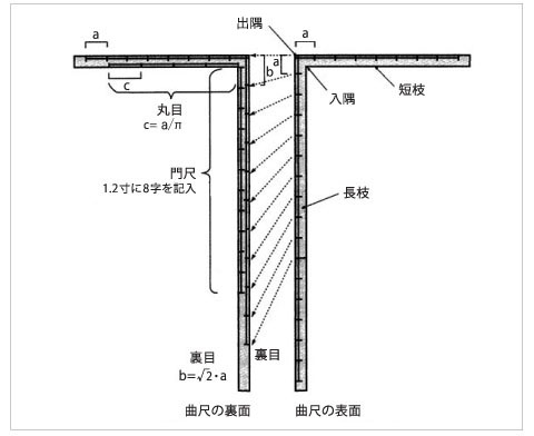 J'écris le carré d'un charpentier et lis avec sashigane, kanejaku, magarigane. Avec l'outil qu'une échelle a été cochée loin par un droit de L-forme orientent la règle, Je demande la longue distance (la longue branche), un côté court avec une main de femme (la branche courte) dans un L-shaped le long côté et une main de femme appelle une table, l'autre côté avec le dos dans un état à droite quand je distanciais vraiment longtemps perpendiculairement. L'échelle (les yeux de cercle) que je le gradue et ai cassé à (les yeux de coin) et le pi que j'ai fait une division de bon visage du carré d'un charpentier √ 2 fois dans une échelle normale (la division de bon visage du carré d'un charpentier), la pétarade dans une table est cochée loin.