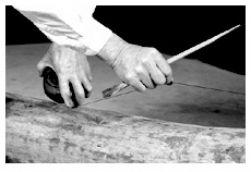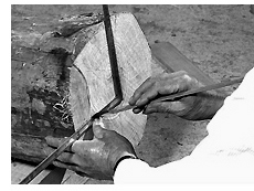 La direction pour les utilisations tient un pot sumi dans la main gauche et je pique le matériel avec une aiguille de "karuko" et fixe un côté du fil de pot. J'arrête le tour de la voiture avec un pouce quand j'ai fait sortir un fil de la longueur nécessaire et je contrôle un fil avec un index à la position nécessaire et vous permets d'être tendu et je choisis directement en haut un fil par la main droite et la reçois. En utilisant l'élasticité du fil, peut tirer une ligne droite exacte de cette manière sans tenir compte de kijo de matériel.