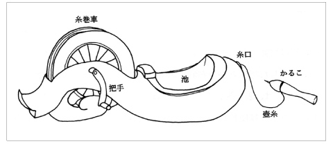 Le pot sumi l'utilise pour mettre une longue ligne droite sur la surface de bois ou d'autre matériel exactement. J'attache une fin de fil de pot à "karuko" et mets d'autre par l'étang qui a sauvé de l'encre de l'Inde d'un commencement et essoufflez-le jusqu'à une voiture de bobine (cf. la figure). Je trempe la bourre de soie avec l'encre de l'Inde et peux entrer dans l'étang et utiliser le fil de soie pour un fil de pot.